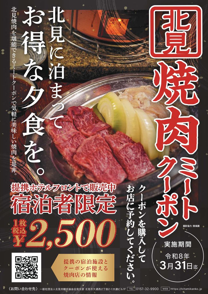 昨年に引き続き、2025年10月1日から2026年3月31日まで、北見市内17店舗の焼肉店でご利用いただける「北見焼肉ミートクーポン」を市内連携の宿泊施設にて販売中です。