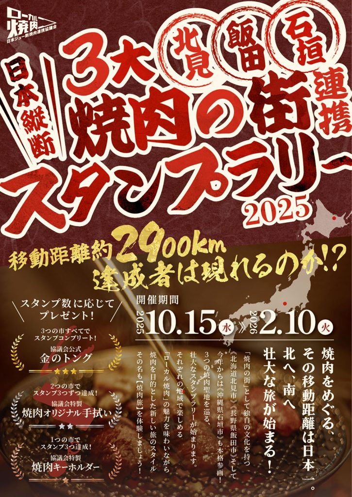 日本随一の焼肉店舗数を誇り、独自の焼肉文化を持つ北海道北見市、長野県飯田市、沖縄県石垣市で構成する「日本縦断焼肉連携協議会」では2025年10月15日より『日本縦断三大焼肉の街連携スタンプラリー2025』を発売中です。